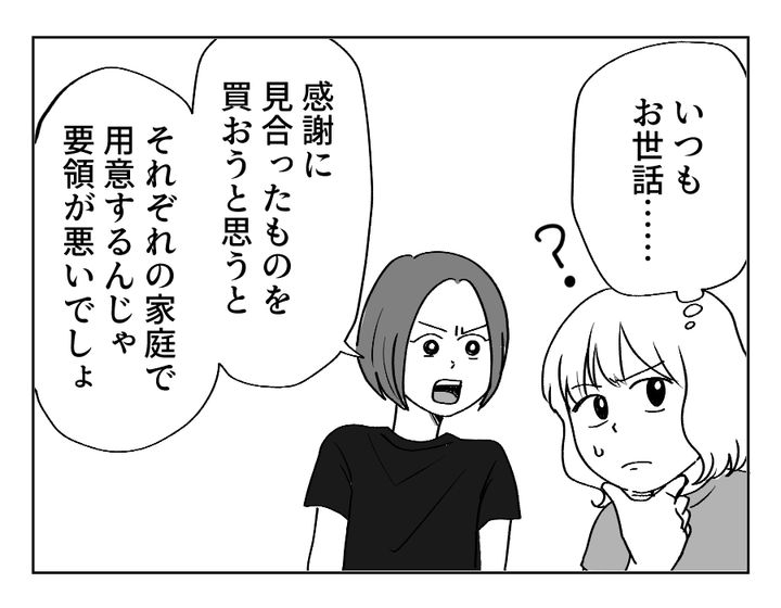 私(シオリ)は、夫のアキラと、5才の長女、3才の長男の4人家族。現在は専業主婦ですが、子どもたちが小学生になったら仕事復帰をしようかな……と思っています。夫の姉ユウコさんは夫婦共働きで、男の子2人(6才、2才)を育てながら義実家の近所で暮らしています。義実家はわが家から遠方なので、私たちの帰省はお盆と年末年始の年に2回。帰省自体には不満はないのですが、夫が帰省の度に義姉に義両親への高額なプレゼント代を渡していることにモヤモヤしていました。そこで夫と話し合い、義姉に「これからは別々で贈りものを渡そう」と伝えてもらったのです。しかしそれに納得がいかない義姉は、頑として「共同」で贈りものをすることを譲らないのでした。