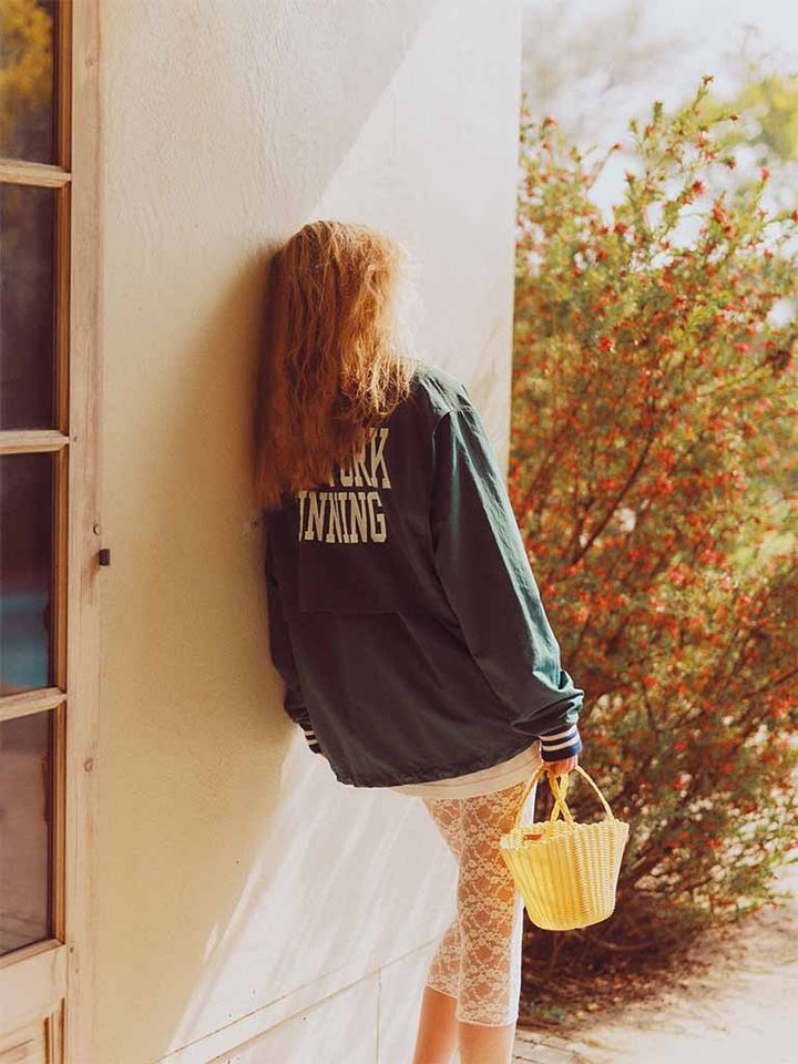 フロントはクウォータージップに、白ロゴが左胸と背面に刻まれたナイロンブルゾン。深グリーン+白の育ちのいい配色なら、ややぶかっとしたメンズのサイジングも女っぽさが増すかわいさに着地。通気性を高める構造に、撥水性の高い素材を使用した、細かな着心地も考えられた1着。