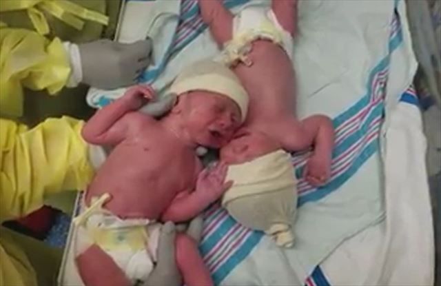 生まれたばかりで、とっても元気よく泣いています。片方の赤ちゃんが持ち上げられ、互いの肌が離れている状態ですが、再び肌が触れあった瞬間に信じられないことが起こります。