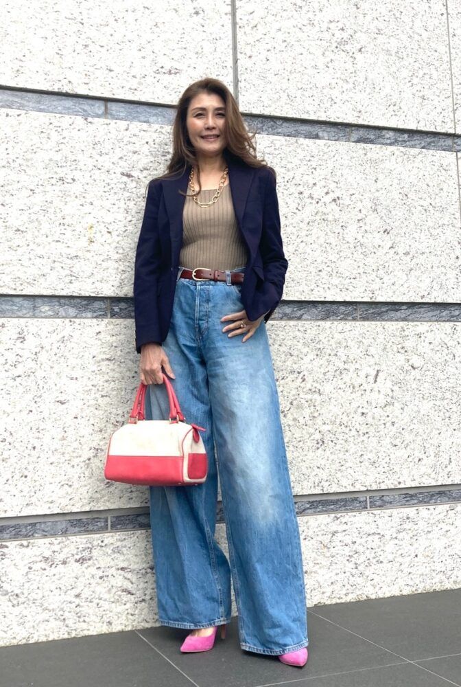 昔といまで、デニムの着こなし方に変化が出てきたという大塚さん。「若いころはデニムに白Tシャツを合わせていました。でも、この頃はいまっぽい太いシルエットのデニムに、大人っぽいインナーを合わせるように」。ポイントは、程よくデコルテを出して華やかさをプラスすることだそう。「ウノアエレ」の長さがあるネックレスを合わせ、上品な華やかさを演出しています。