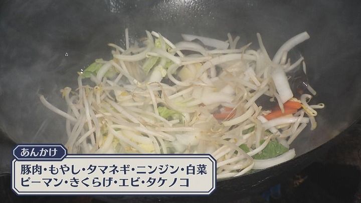 豚肉、もやし、人参、白菜などの野菜と、きくらげ、エビなど9種類の具材を炒めます。