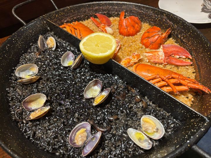 ダブルパエリア(イカスミとオマール海老)大きいオマール海老と、貝とイカに…めちゃくちゃ豪華✨レモンを絞るとさらに美味しさ倍増海鮮好きさん注文必須です余ったらおにぎりにして下さるんです!嬉しい✨翌朝もお家で食べられますよ〜!!🤩