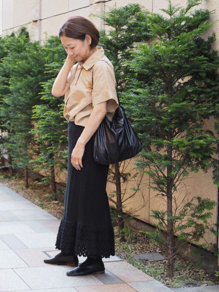仕事の打ち合わせのため、表参道を訪れていたりんこさん。トップスは衿付きのシャツをセレクト。歩くたびしなやかに揺れるマーメイドシルエットのニットスカートを合わせることで、大人の魅力が倍増。「色はベーシックなカラーを選ぶことが多いので、素材やディテールがこったものに惹かれます」。シンプルながら表情豊かなスタイリングがステキ。