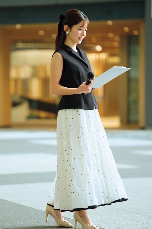 バランスの取りやすいショート丈の黒ジレをノースリーブのドッキングワンピに重ねて、ジャケット代わりに。白地に浮かべたドットで大人可愛く。コンパクトニットとふんわりフレアを組み合わせた華やかデザイン。グッドレディなハーフアップは全方位ウケ必至。