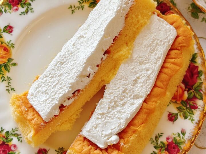 縦に切ってみると、二人分はありそうなサイズ感です!クリームもたっぷり~。ふわふわとした食感と、もちっとした歯ごたえ~。これこれ!思い出しました、生シフォンの味わい。ホイップも甘過ぎないので、たっぷりでも食べられちゃう!半分に切ったサイズでもボリューム感あり!