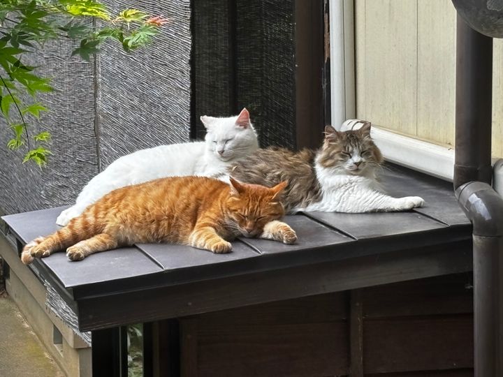中庭を見てみると、な、なんと猫ちゃんたちが気持ちよさそうに寝ていました🐈