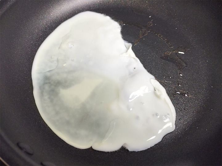 1. 小さめのフライパンに少量の太白胡麻油を薄くなじませ、卵の白身を入れて触らずに弱火で焼きます。
