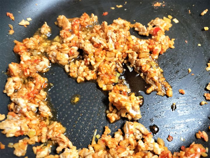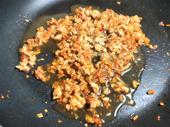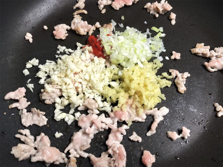 6. 豚肉が白っぽく変わってきたら、豆板醤、長ねぎ、しょうが、にんにくを加えて炒めます。