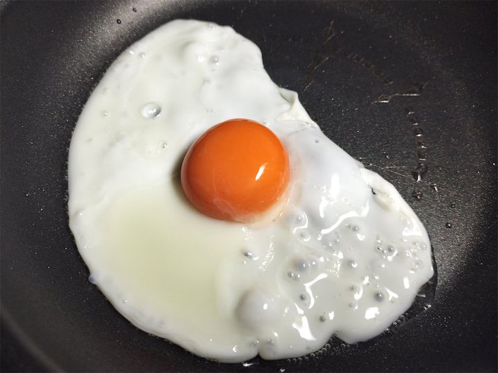 2. 白身の表面が固まったら黄身を上に乗せ、フタをして焼きます。