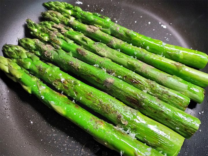 3. 別のフライパンに太白胡麻油を引いてアスパラガスを並べ、フタをして中火で2~3分蒸し焼きにします。