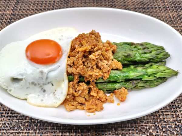 次にひき肉と一緒に食べてみると、しっかりとスープや調味料がひき肉の中に染み込んでいて、さっぱりとしたアスパラを包み込むようにも思えました。豆板醤は少量しか使っていませんが、けっこう辛みが感じられるのがアクセントになっていて、そこに卵黄を潰して絡めて食べてみるとやさしいコクと旨味がソースごと包み込んでなぜかアスパラを強く感じて不思議でした。