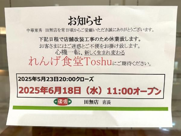 久々に田無アスタのレストラン街に行くと、なんと「中華東秀」が休業していました。6月18日(水)からは【れんげ食堂Toshu田無店】としてリニューアルオープンするとのことです。