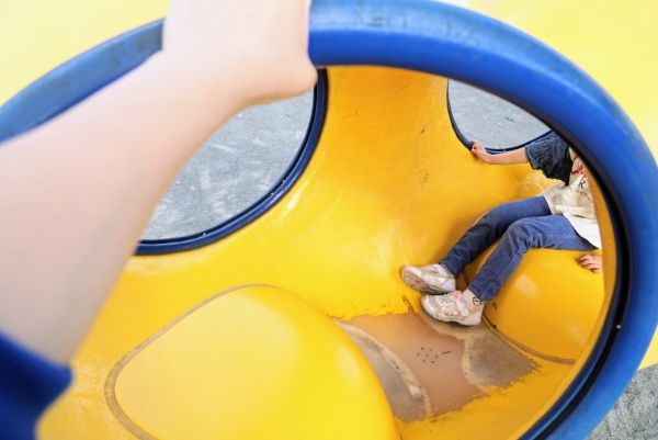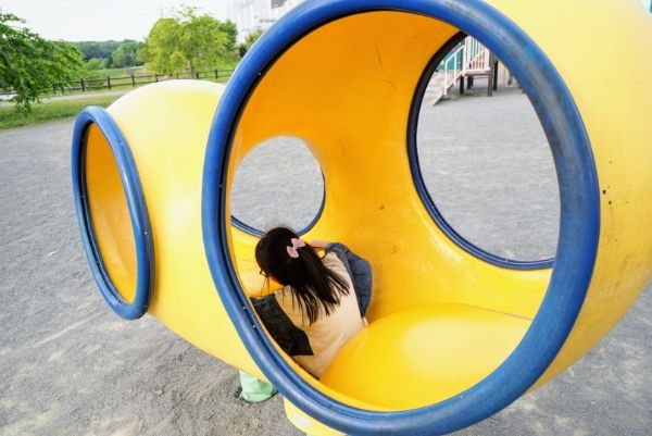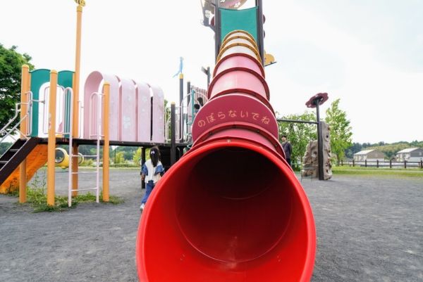 こちらは幅広滑り台。少し怖いので、前を見れないというポーズになっている様子。けっこう角度もあるのでスリル感がちょうどいい。