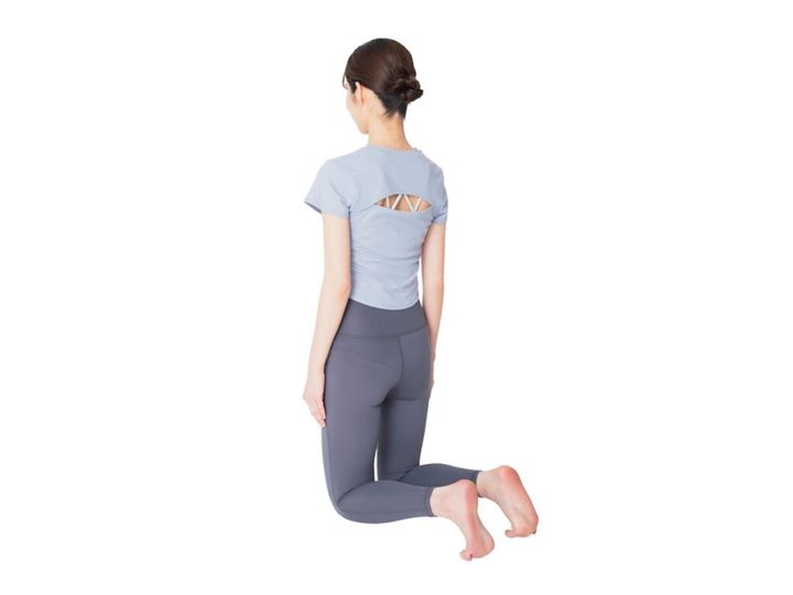 ひざ立ちになってつま先を立て、脚を腰幅に開き、背すじを伸ばして手は自然に下ろす。ひざが痛い場合は、タオルやヨガマットを使いましょう。