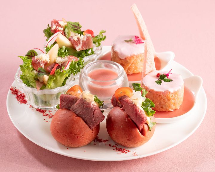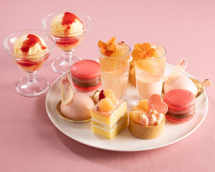 桃が旬を迎えるこの時期限定の、ピンク色に染まった桃のアフタヌーンティー。ショートケーキやタルト、ムース、マカロンなど、スイーツすべてに桃を使用し、桃のみずみずしさや食感、香りなど余すところなく愉しめます。中でも、「ピーチ・メルバ」は、桃のコンポートとバニラアイスクリーム、ラズベリーのソースで作られるクラシックなデザートで、桃の濃厚な甘さにラズベリーの甘酸っぱさが加わり夏にぴったりです。また、桃のジャムで味わう、相性抜群の杏仁のスコーンや、桃と生ハムのサラダをはじめ、サーモンとじゃがいものタルタルなどピンク色に揃えられたセイボリーも充実しています。