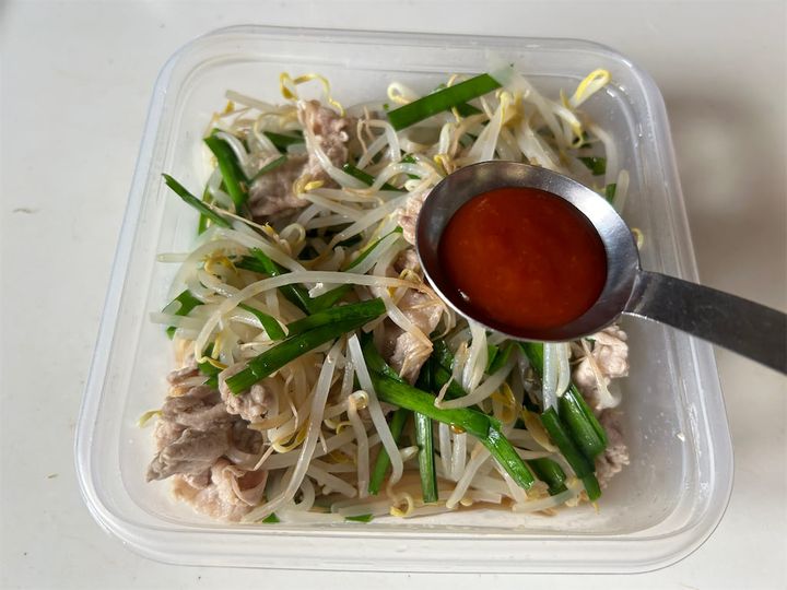 ポン酢じょうゆで味付けされた「豚ポンもやし」に、赤じそふりかけの爽やかな風味が足されてより食欲のそそる味に。