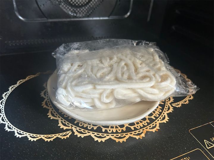 冷凍うどん(1袋)を袋の表示通りに解凍したら、完成した「豚ポンもやし」の上にのせます。