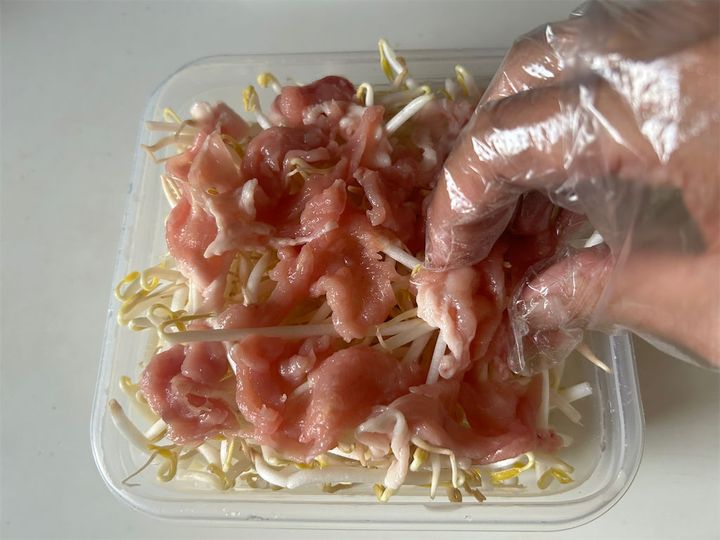 もやしの上に、広げた豚こま切れ肉を均等に並べます。