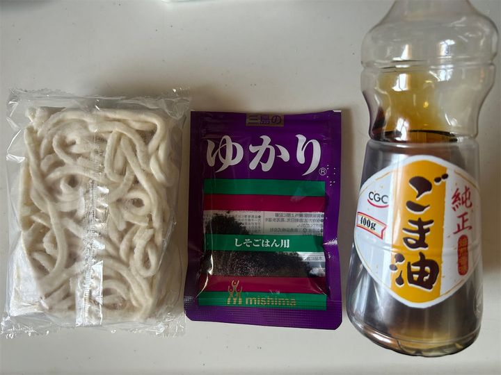 ②ボリューム爆上げ!「冷凍うどん&赤じそふりかけ&ゴマ油」