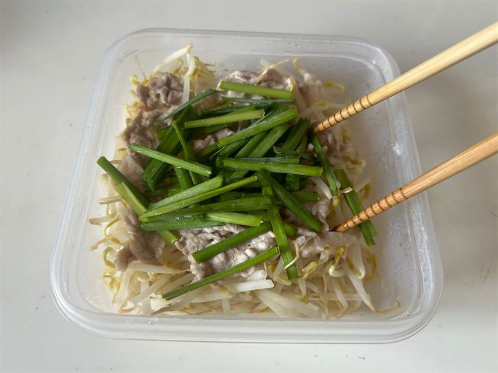 「豚ポンもやし」のレンジ加熱をした後、ポン酢じょうゆを入れる前の熱いうちに3cm長さに切ったニラ(20g)を加えて混ぜ合わせます。