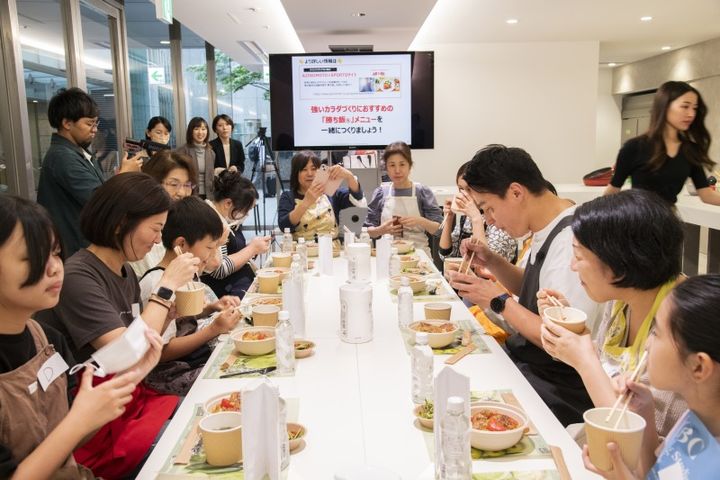 「勝ち飯®︎」アンバサダーとして活動されている元オリンピアン競泳選手の松田丈志さんが「勝ち飯®︎」について分かりやすく講義して下さった後、参加者と一緒に和気藹々とクッキングレッスンにも参加。最初はぎこちない様子だった参加者の方々も、調理を通じてだんだんと笑顔がみられるように。最後は皆さん笑顔で勝ち飯を実食し、大盛況のイベントでした!