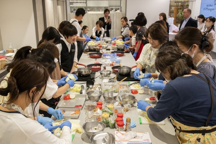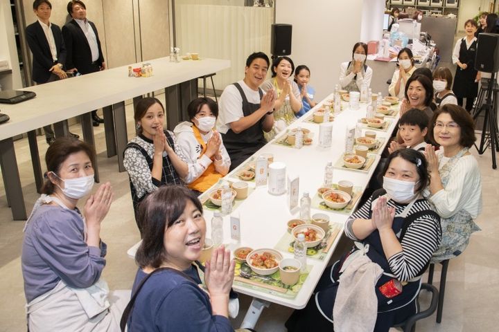 今回、トップアスリートだけではなく一般生活者にも「勝ち飯®︎」を役立ててもらいたいという想いから、味の素(株)の「勝ち飯®︎」メソッドとABCクッキングスタジオの調理レッスンを掛け合わせ、「勝ち飯®︎」について理解してもらった上で実際に作ってもらおうというイベントが実現しました。参加者は総勢28名!