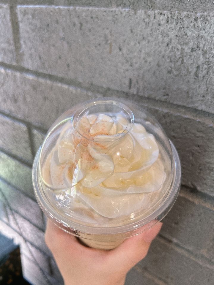 アールグレイを中心にハーブとミルクを合わせたフラペチーノ に、ベルガモットやレモンピール、オレンジなどをブレンドしたパウダーを振りかけ、仕上げに、はちみつをトッピングしてあります。