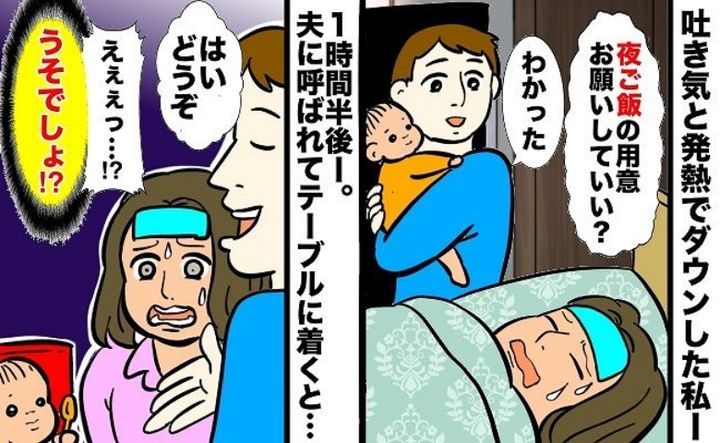 娘が1歳のときのお話です。もともと胃腸の弱い私。その日も昼過ぎから胃腸のあたりに気持ち悪さを感じていました。どんどん悪くなる体調。水分もとれないほどの強い吐き気に加え、熱もあがってきてしまいました。そこで夫に夜ご飯の準備をお願いしたのですが……?