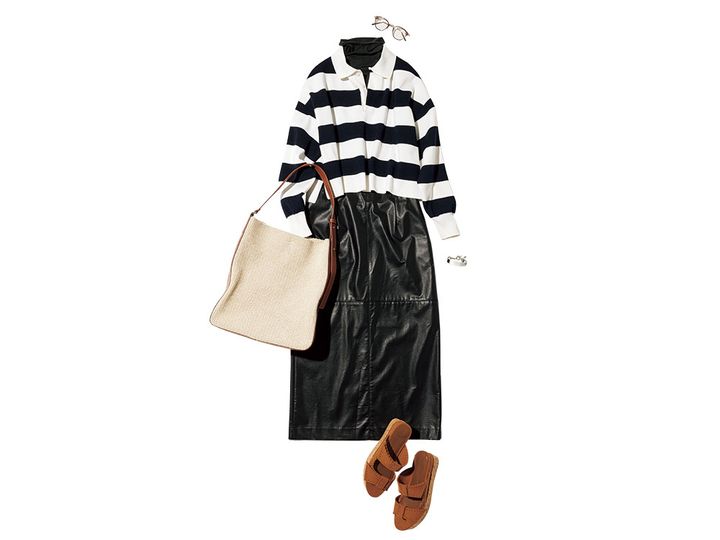 シアータートルカットソー¥24,970(エイチ ビューティー&ユース/エイチ ビューティー&ユース)スカート¥14,300(マルゥ ユナイテッドアローズ/ユナイテッドアローズ カスタマーサービスデスク)バッグ¥25,300(アンドミューク/アマン)サンダル¥33,000(ツル バイ マリコ オイカワ)メガネ¥46,200(アイヴァン/アイヴァン 東京ギャラリー)バングル¥8,640(アビステ)