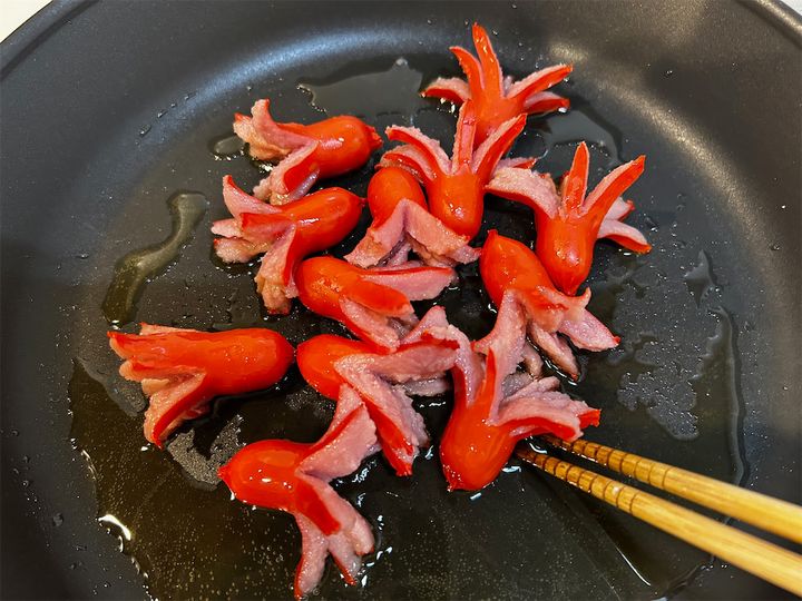 4.動画によると、タコさんウインナーは「多めの油に弱めの火力」で焼くのがいいのだとか。