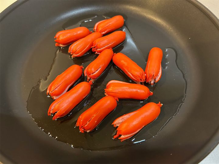 ウインナーの分量をどのくらいにするか少し悩んだのですが、筆者が購入したものには1袋に12個入っていたので、とりあえず12個全部を使ってみることに。ちなみに、動画では「お徳用」のウインナーを1袋使っていました…。12個でも十分多そうなのに、筒井さんスゴすぎますね。