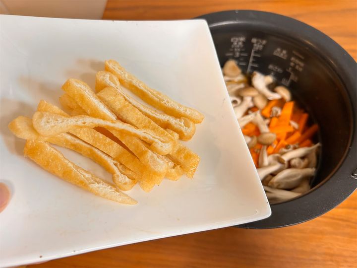 油あげは、動画を見た感じ油抜きはしていないようなので、このまま細切りに。