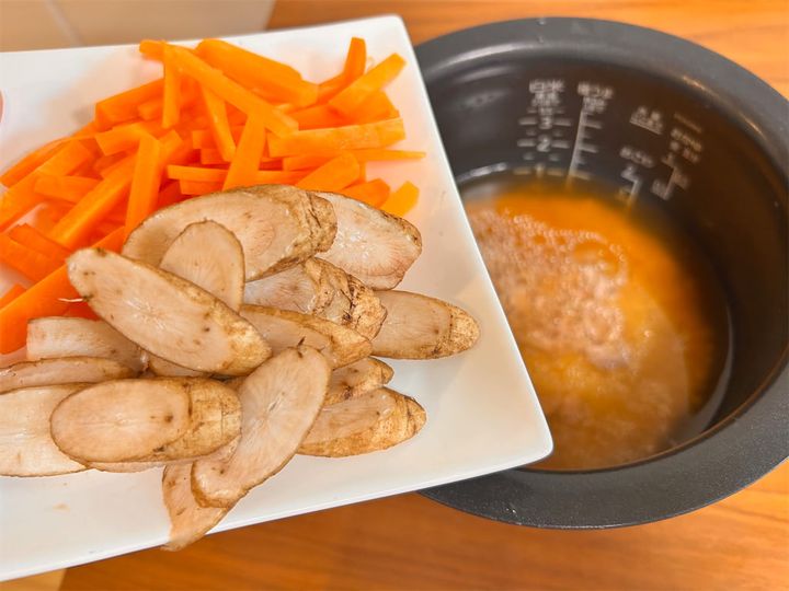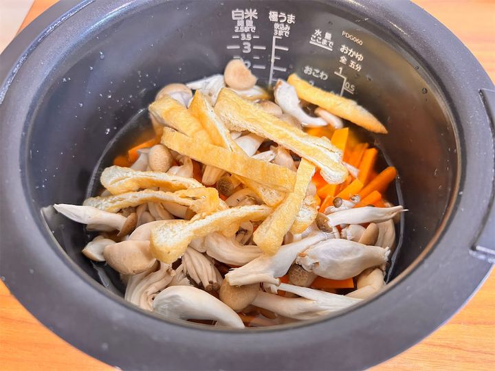 1で切っておいた、ごぼうとにんじんも投入。炊き込みご飯の具材は、固いものから順に重ねると良いと聞いたことがあるので、ごぼう、にんじんの順に入れてみます。
