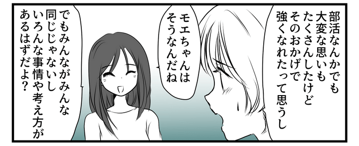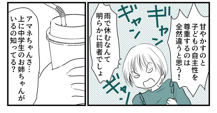 私はモエ。ママ友のセリナちゃんとカフェで会って、アマネちゃんママの雨の日の休ませ方にモヤモヤしていることを話しました。するとセリナちゃんは、「家庭の考え方」とあっさり。私は、雨の日でも学校に行くことの大切さや、そのことで養われる忍耐力について主張しましたが、なんだかのれんに腕押しです。私はまたもやモヤモヤ。なぜセリナちゃんまでアマネちゃんママの気持ちを理解しようとするのでしょうか?