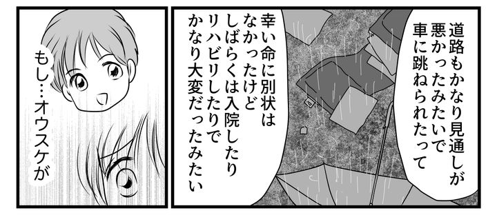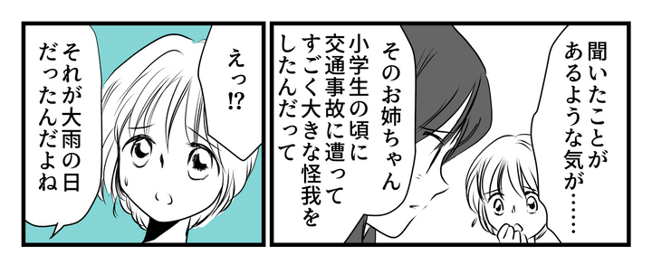 セリナちゃんが私に話してくれたのは、アマネちゃんママの上の娘さんの話でした。以前雨の日に交通事故にあったという話でした。事故の連絡を受けたときのアマネちゃんママの気持ちを考えると……想像もできないくらい、辛かったと思います。もしオウスケがそんな目に遭ったら……考えただけで私も怖くなってしまいました。