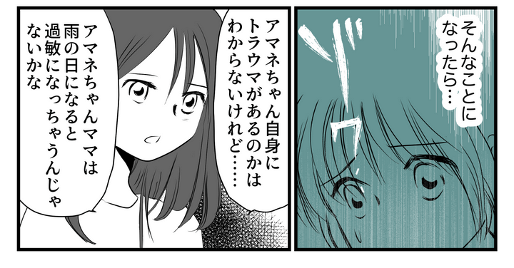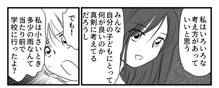 「モエちゃんはそうなんだね。でもみんながみんな同じじゃないし、いろんな事情や考え方があるはずだよ?」そういうセリナちゃんに対して「甘やかすのと子どもの自主性を尊重するのは全然違うと思う」と主張する私。すると……セリナちゃんがある話を私にしてくれたのです。アマネちゃんママが雨の日を不安がる理由です。