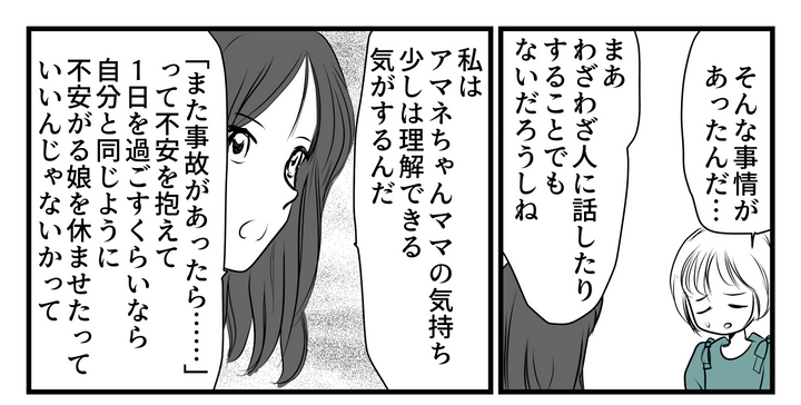 「みんなそれぞれに考えや事情がある」と諭された私。再度「雨でも学校に行くべきだ」と反論すると、セリナちゃんはアマネちゃんママの過去を教えてくれました。大雨の日の事故だったと聞いて、言葉が見つかりませんでした……。