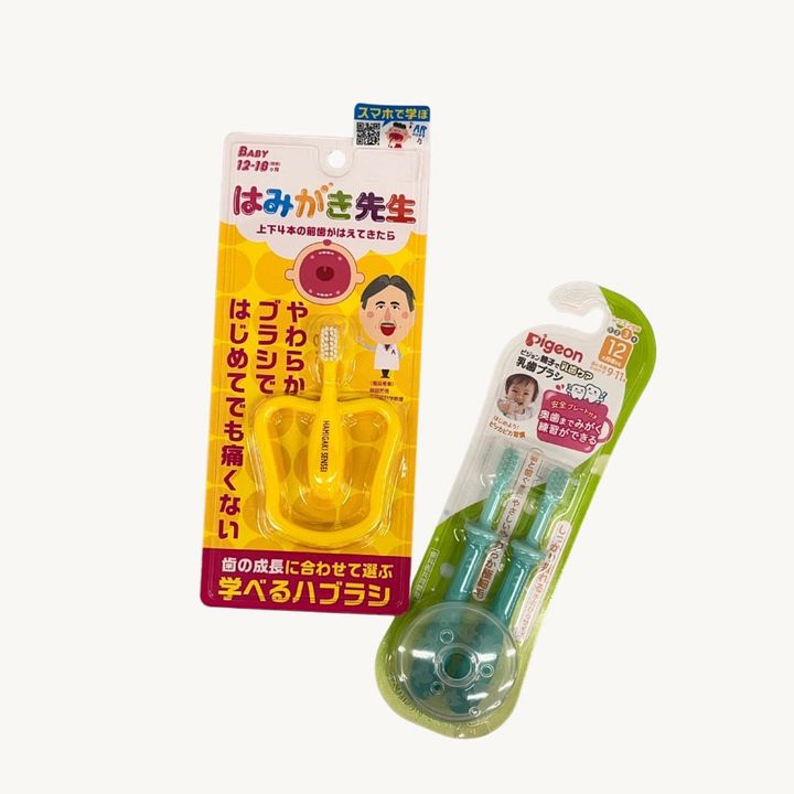 生えたての歯は虫歯になりやすいので、1本でも生えてきたらしっかり磨いてあげましょう。初めての歯磨きは歯ブラシでもガーゼでも磨ければOKですが、乳幼児用のものだと素材も柔らかく、サイズも小さいので使いやすいですよ。ピジョンの安全プレート付きの乳歯ブラシや、はみがき先生のリング歯ブラシだと喉付きが防止できてより安心です。前歯の真ん中にある、唇の裏から歯茎に向かって縦に伸びている上唇小帯は歯ブラシが当たると痛いので、指で押さえながら磨いてあげるとよいです。