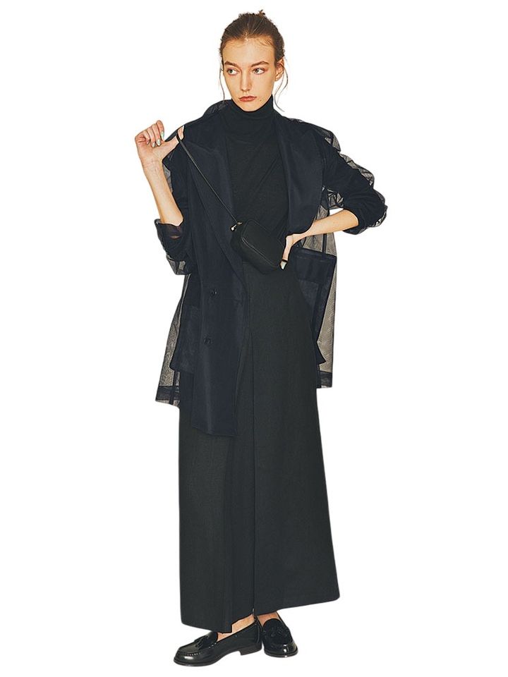 黒チュールワイドジャケット/プランクプロジェクト(プランクプロジェクト 青山店) 黒タートルネックニット/コー(イーストランド) 黒リネンフレアスカート/ロンハーマン バッグ/ラシット(ラシット 西銀座店) ローファー/HARUTA