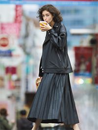 チュールをドッキングしたドレッシーなワンピースを主役に。ライダースやキャップなど、やんちゃな黒で脇を固めてクールな表情をキープ。色数をしぼることで、個性派なかけ合わせがシンプルに整う。