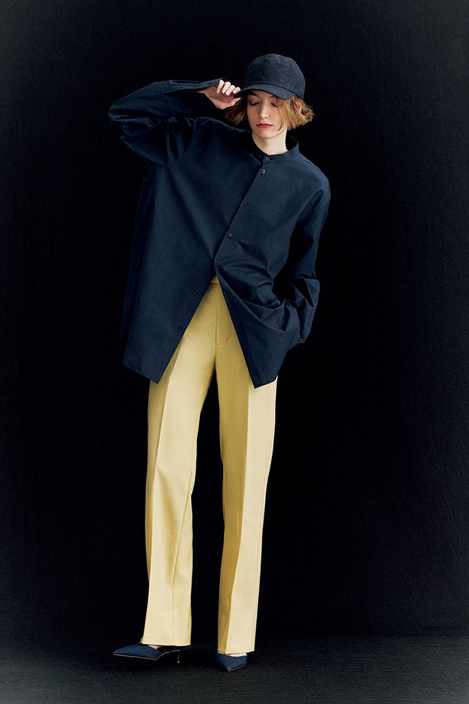 ベージュの延長で使えるうえ、ひかえめなアクセントカラーにもなるクリームイエローは、ベーシックカラー並みに万能。まったりとした色みで強さを中和できるため、ネイビーのシャツやキャップでとことんメンズライクにふりきっても穏やかなまま。キレイを保つ細身のパンツを選択。