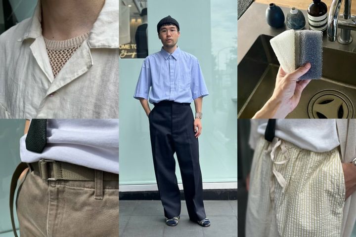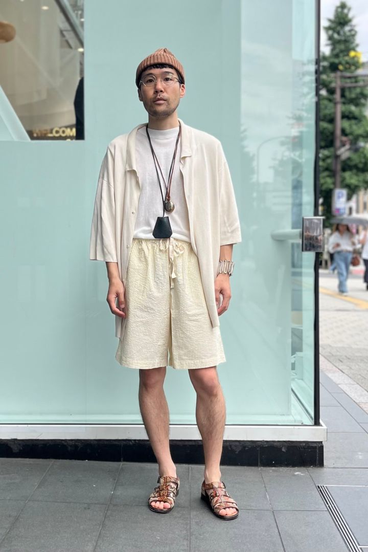 「これはかなりの掘り出しモノです! 」と安武さんがオススメしてくれたのは、なんとレディースのルームウェアとして提案されているハーフパンツ。「長めの丈とゆったりとしたシルエットがとにかく今っぽく、トレンド感あるハーフパンツスタイルを構築できる1本です。そして何より、イエローのシアサッカーというのが洒落ています。本当、部屋着にしておくにはもったいない! 」と大絶賛。