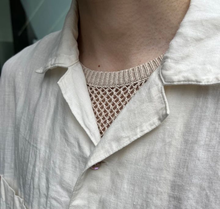 「じつはメッシュのトップスをずっと探していたんです。でも、インナーでしか着ないのにどれも高いと思っていたら、なんと無印良品にありました! そもそもシャツのインナーって、タンクトップだとネックが開きすぎだし、かといってTシャツだと抜け感がない。このニットはネックが詰まっていますし、メッシュなので抜け感がある。まさに理想的なインナーなんです」