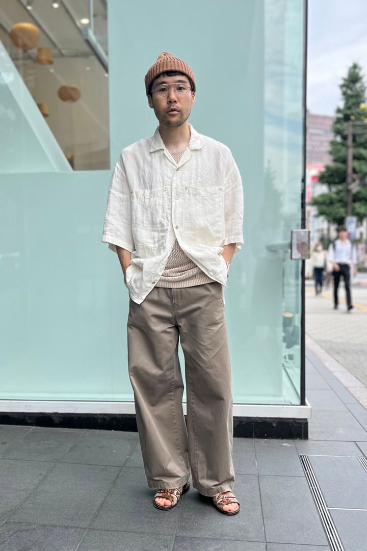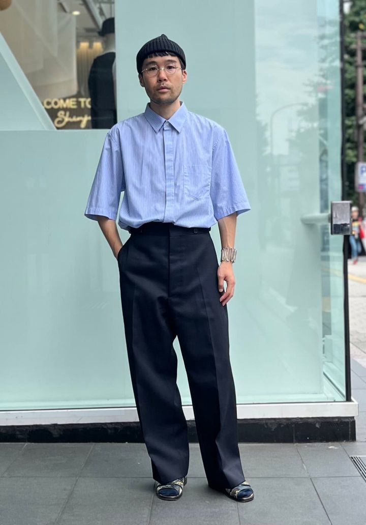 今回ピックアップしたアイテムの中で、唯一のメンズがこちらのシャツです。その魅力を聞いてみると、「とにかく袖の長さがイイんです。半袖シャツってすごく難しいアイテムで、袖が短いといわゆるビジネスシャツに見えてしまう。でもこれは、やや長めの5分丈にすることで差別化を図っているのが素晴らしい! さらに襟が直線的でレギュラーカラー、そしてボタンが見えない比翼仕立てというミニマルなデザインも◎。ポケットもやや下に設置しているのもポイントで、これによってファッション感が高まっているんです」
