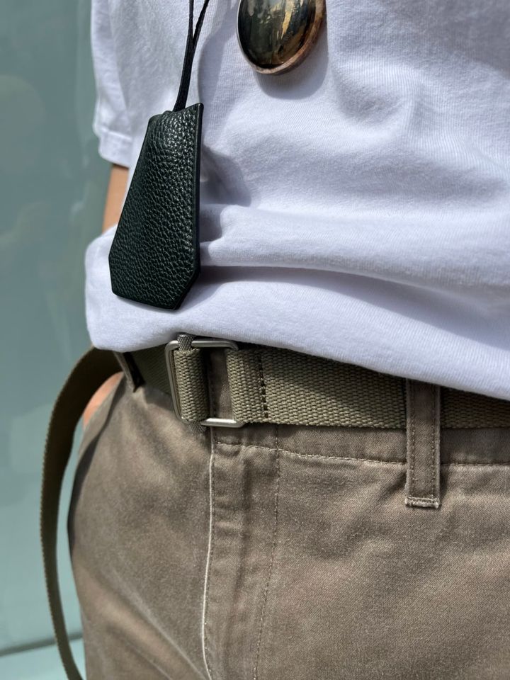 ガチャベルトほどカジュアルすぎず、レザーベルトほど上品すぎない。気軽に取り入れられて、かつ洒落た腰まわりを演出できるなんてうれしい限りです。色は黒・サンドベージュ・カーキグリーンの3色展開ですが、バックルのクリーンなシルバーが引き立つのは、安武さんが選んだカーキグリーンだと思いました。なにげに使い勝手も一番だと思うので、ワードローブにあるとかなり重宝するはずです!