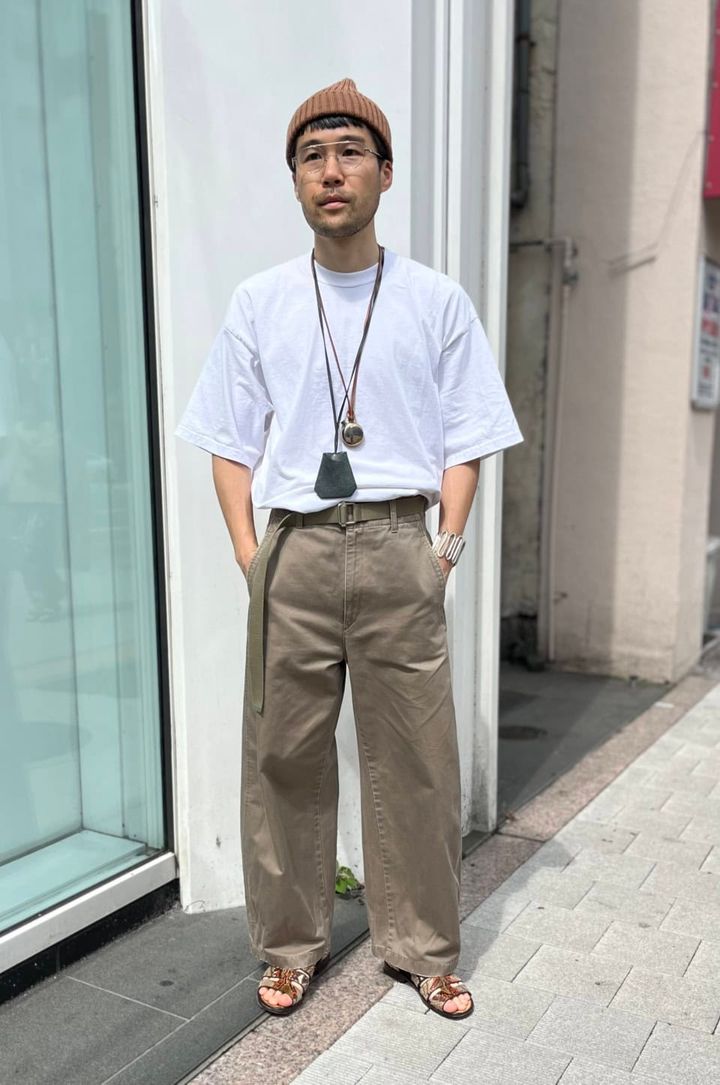 ベルトの垂れ具合も理想的で、ハイウエストのワイドなチノパンとも好マッチ