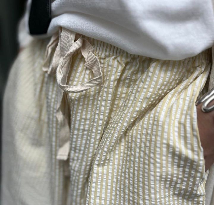 ルームウェアを街着として活用するとはさすがです! 確かにイエローのシアサッカーって他で見かけないですし、まわりとも差をつけられると思います。さらにシアサッカーは肌への接地面積が少なく、清涼感あるはき心地を楽しめるので、これからの季節にヘビロテで活躍するはず!