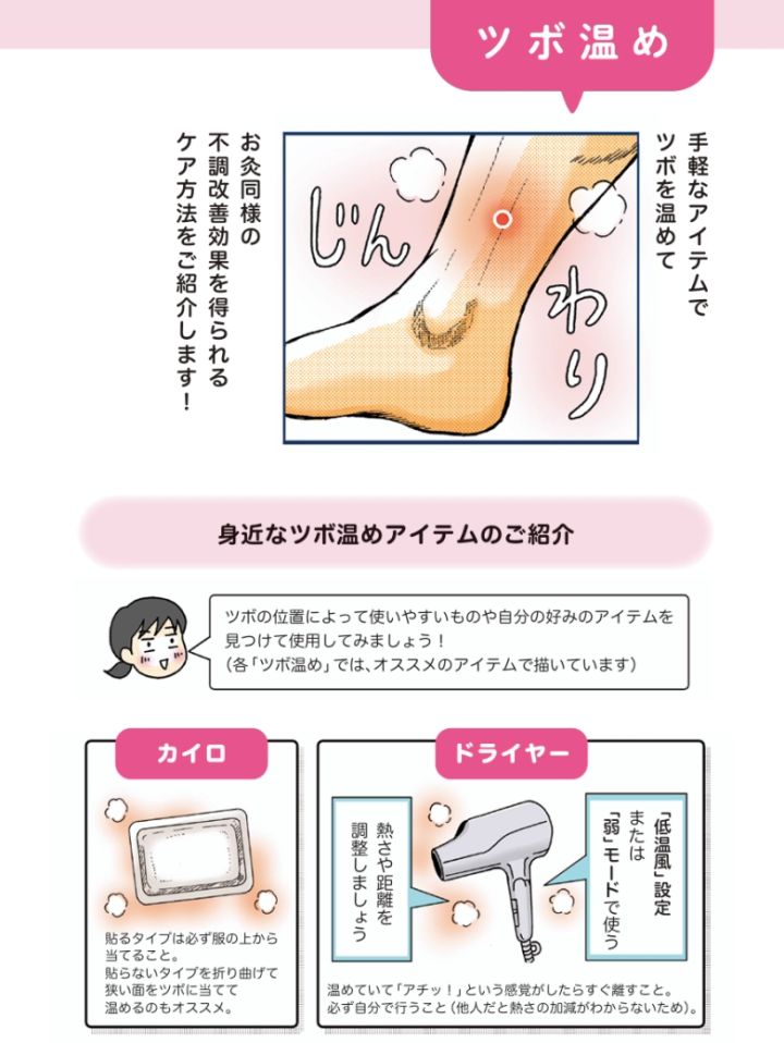 筆者の崎田さんが実際に鍼灸院で施術を受け、東洋医学のツボ療法の効果を実感したといいます。そこから、自分でできるツボ押しについて取材を行い、セルフケアをまとめたのが「ツボ編」です。