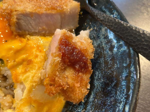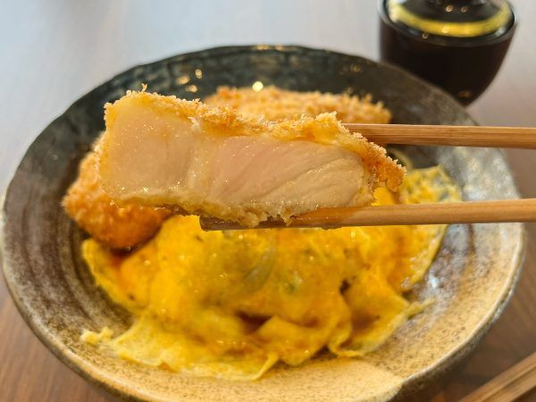 「LYB豚とじないかつ丼」は、卵でとじず、揚げたてのとんかつをトロトロの卵の上に乗せることで、サクサクの衣とジューシーな肉の食感を存分に楽しめます(3,200円)。注文を受けてから揚げてくれるので、本当にサクサクでした。