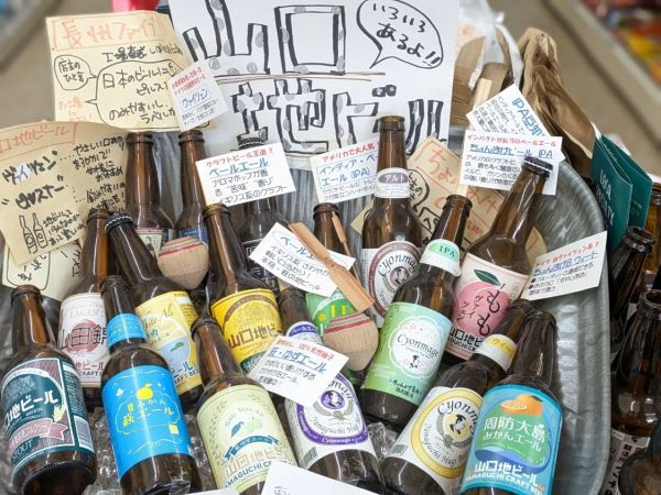 お店の入り口には、クラフトビールが何種類も入った籠が置かれています。「界  長門」でお食事の際も、何種類かはメニュー表で見ましたが、山口県にはこんなにも沢山の地ビールがあるのですね。